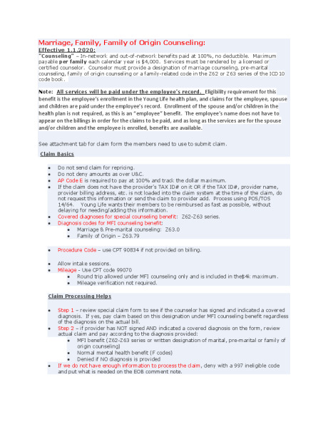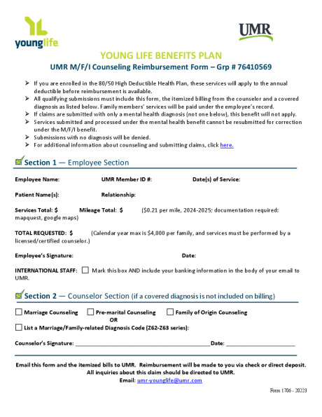For those enrolled in either of the Young Life medical plans, two separate counseling benefits are offered to you and your family members. As this can sometimes be confusing, listed below is an explanation of each benefit and how claims are submitted to UMR for payment.