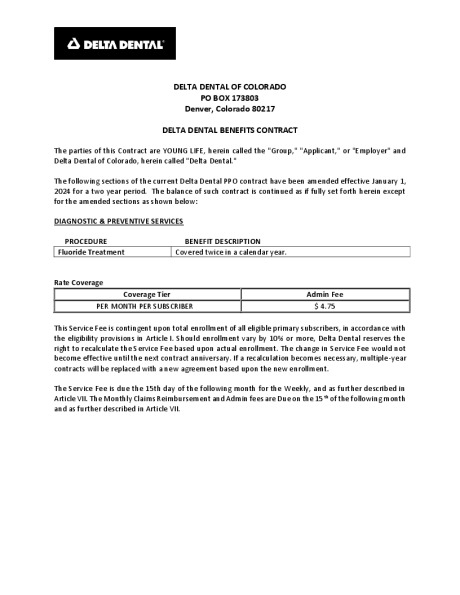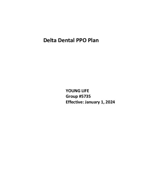 Young Life’s dental plan is administered through Delta Dental of Colorado. This is an employer-paid benefit for eligible employees and family members enrolled in the Young Life Benefits plan. Diagnostic and preventive services are covered at 100%, while other services are covered at 80% up to a maximum of $3,000 per covered member with a $50 deductible for individuals and a $150 combined deductible for families. Services received from providers not in the Delta Dental network are subject to the out-of-network maximums for allowable charges.