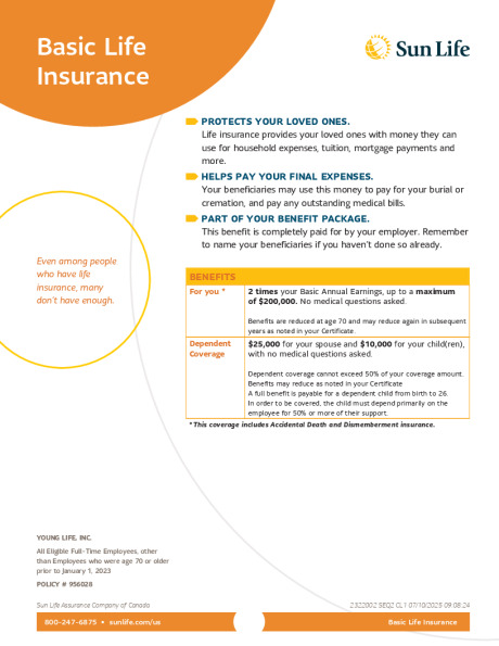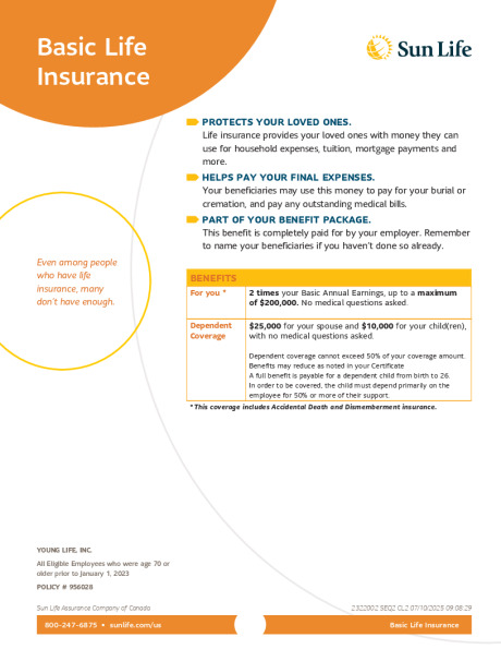 Young Life provides each eligible employee with Group Term Life/AD&D insurance through SunLife. This benefit is 100% employer paid, and includes double indemnity for AD&D. Below are the details for your employer-paid life coverage which may double for accidental death: