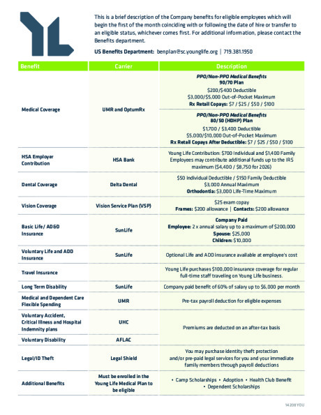 What’s new in 2026? After prayerful consideration, Young Life’s leadership and benefits committee have adopted the following changes to our 2026 benefits plan. These changes keep us compliant and manage increasing benefits costs while, most importantly, ensuring that the overall plans provide our staff and loved ones with very competitive benefits.